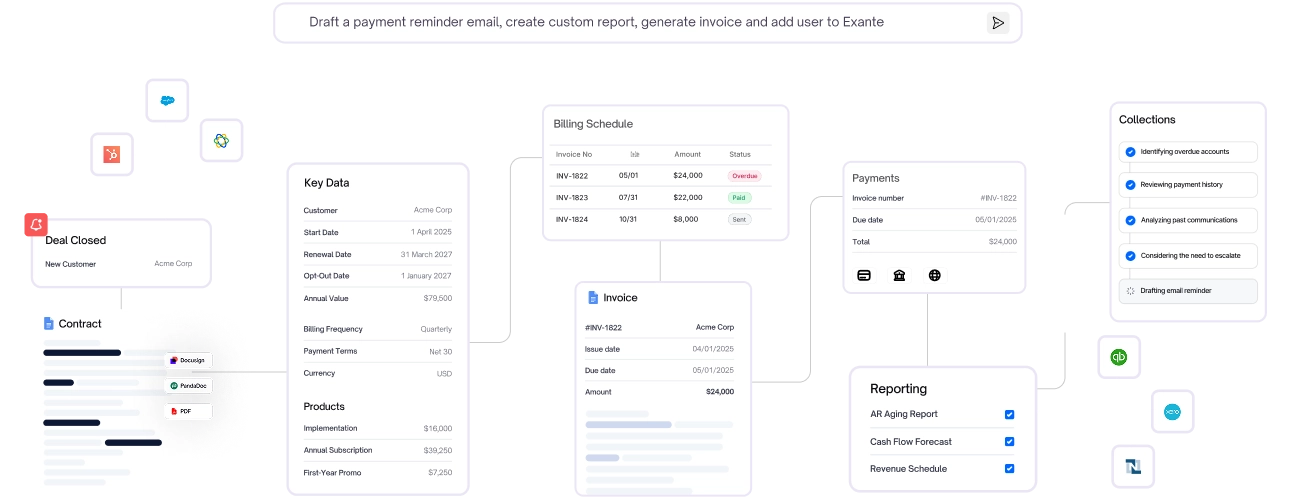 Type your request in natural language—whether it's generating a report, sending an invoice, or analyzing data.